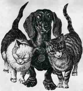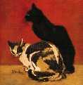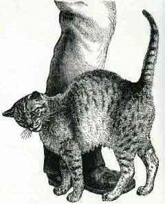 Theophile-Alexandre Steinlen was born in Switzerland and later resided in France. He was a highly-productive and popular illustrator from the late 1880s through the end of World War I. His renditions of cats are among the best in the world. He was a master of reflecting cats' moods in his drawings, and "The Steinlen" derives from interpretation of the contortions shown by some of his subjects. Our Nicky (aka "Squidgy") is a master of "The Steinlen," practicing it on a daily basis! The following illustrations--though not those of Steinlen--make clear the intended effect.